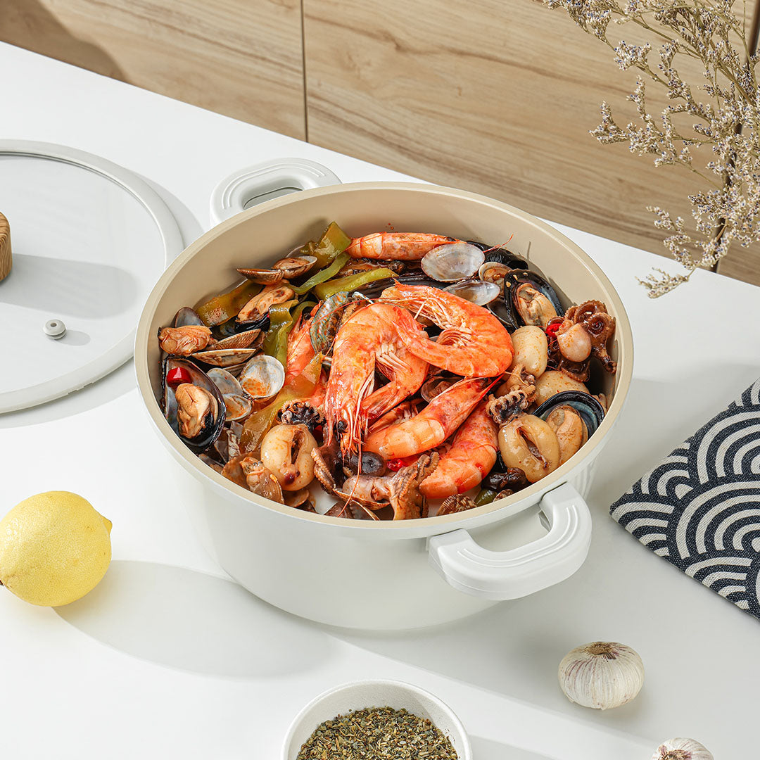 【熱ムラを解消する多熱源対応】4層構造底がIH/ガス/電気で均一加熱。時短調理しながらも食材の旨味を引き出します。