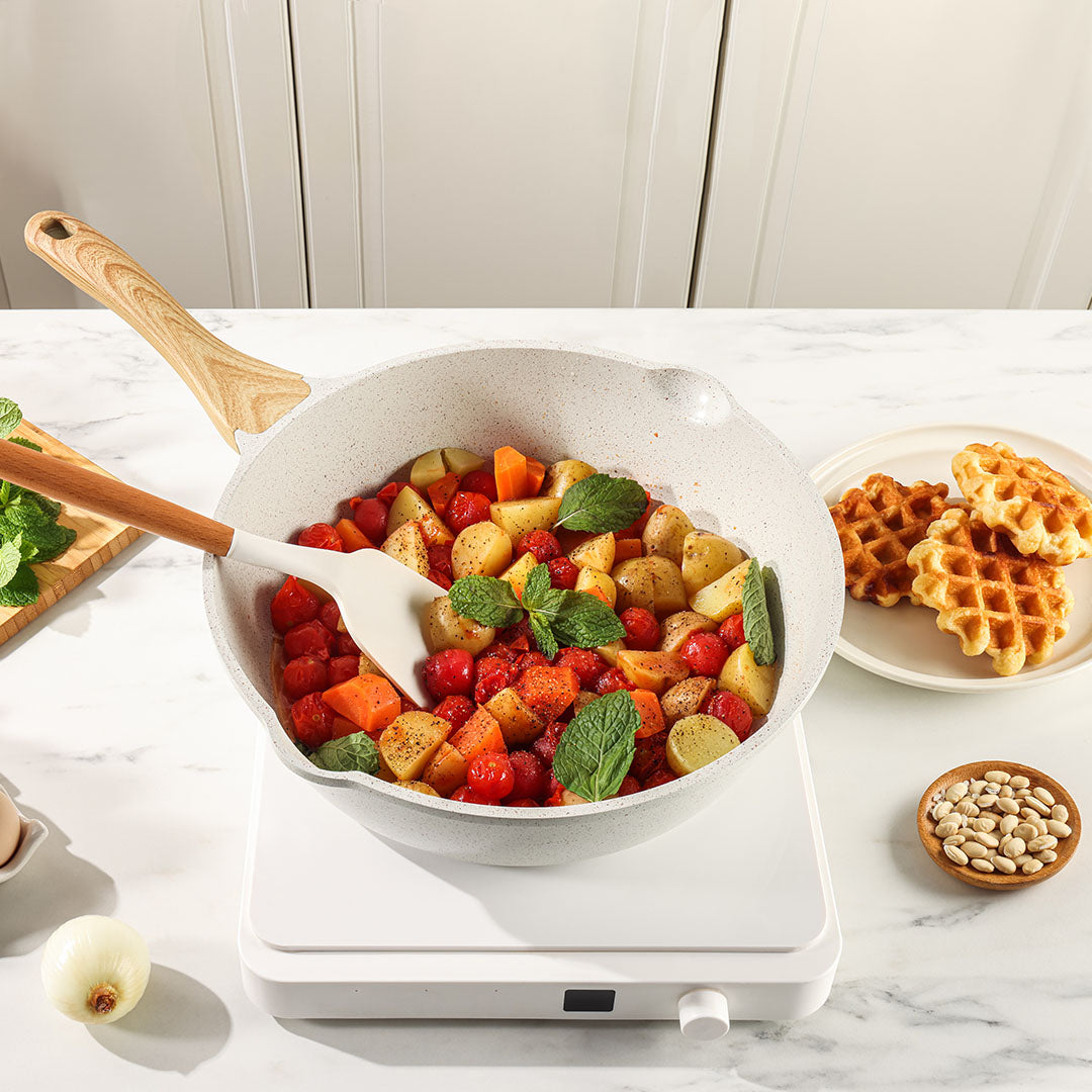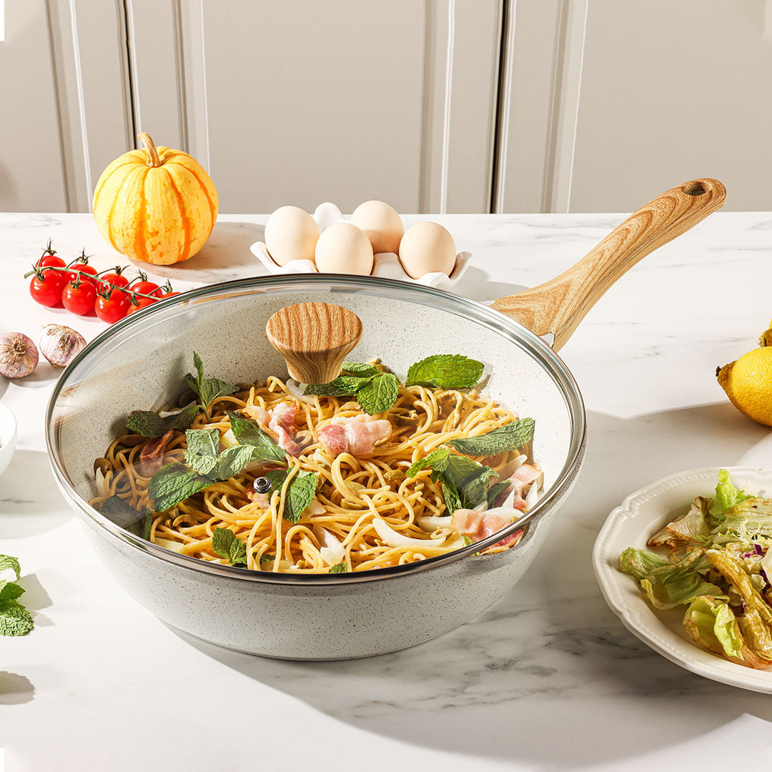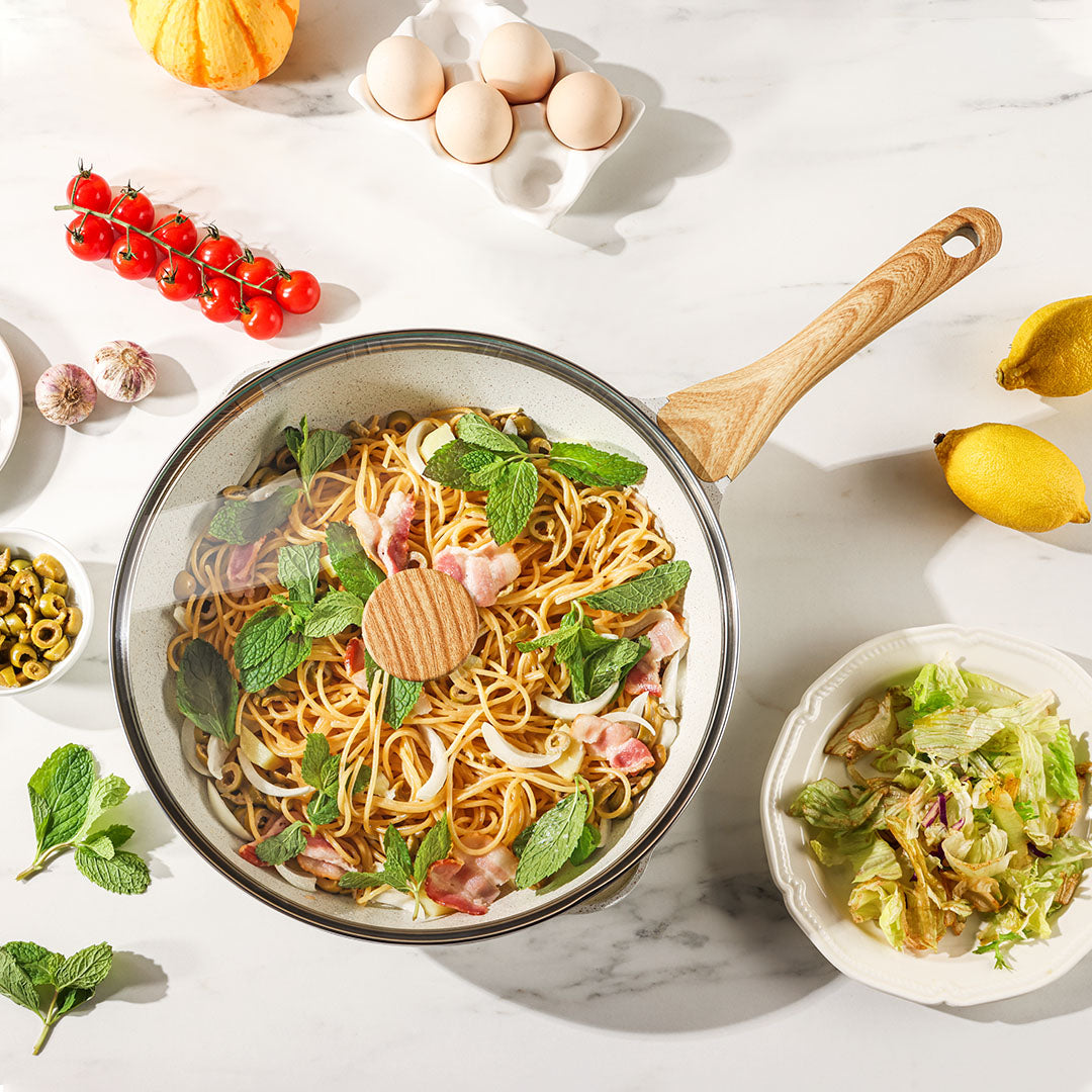 【強化ガラスの蓋&耐熱ハンドル】強化ガラスの蓋と耐熱ハンドルは、鍋内の材料の調理プロセスを簡単にコントロールし、キッチンでアートを創造するのに役立ちます。