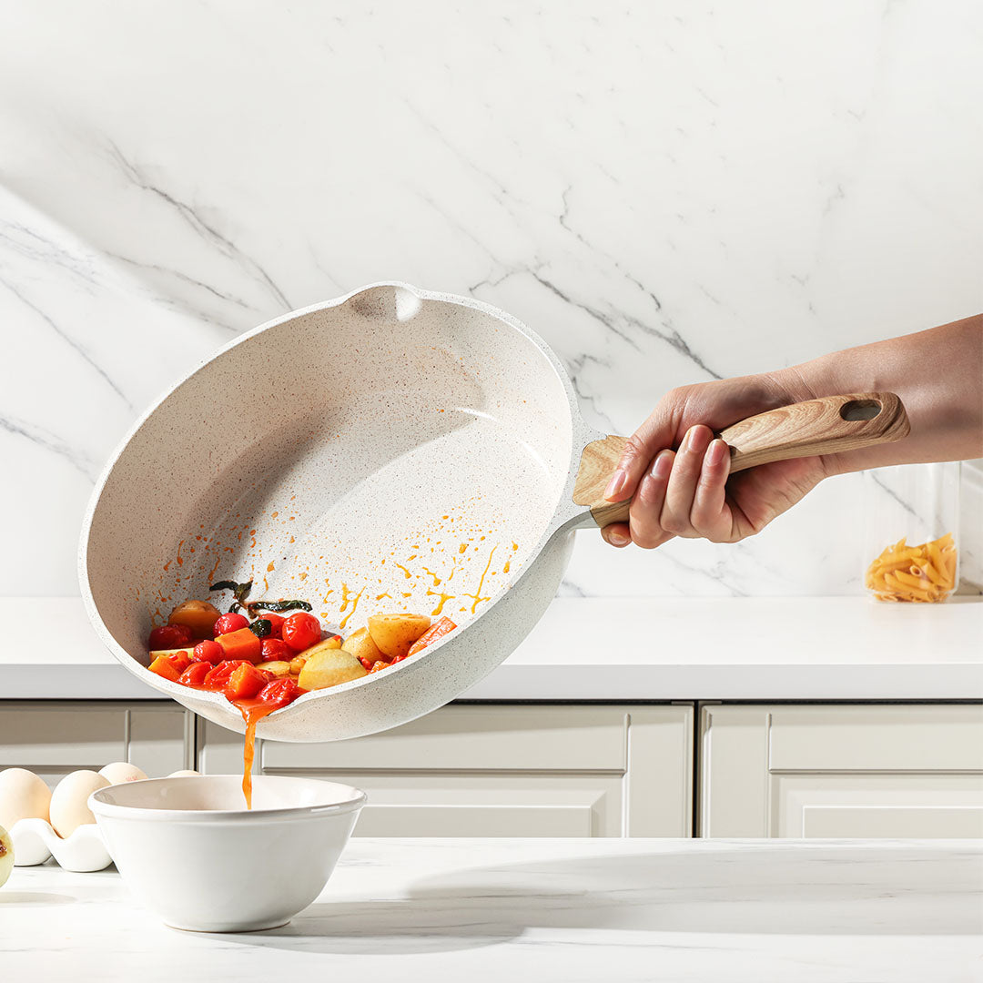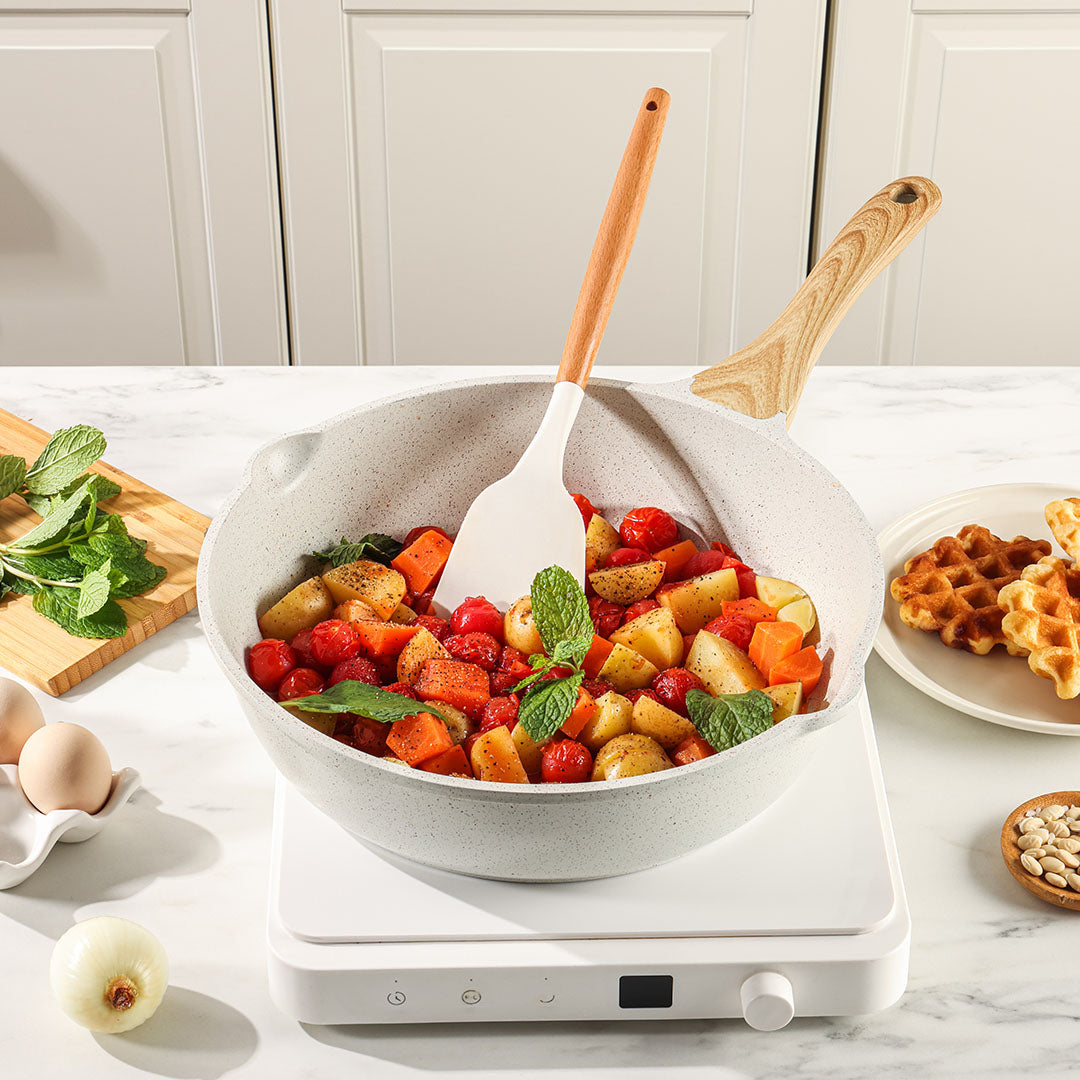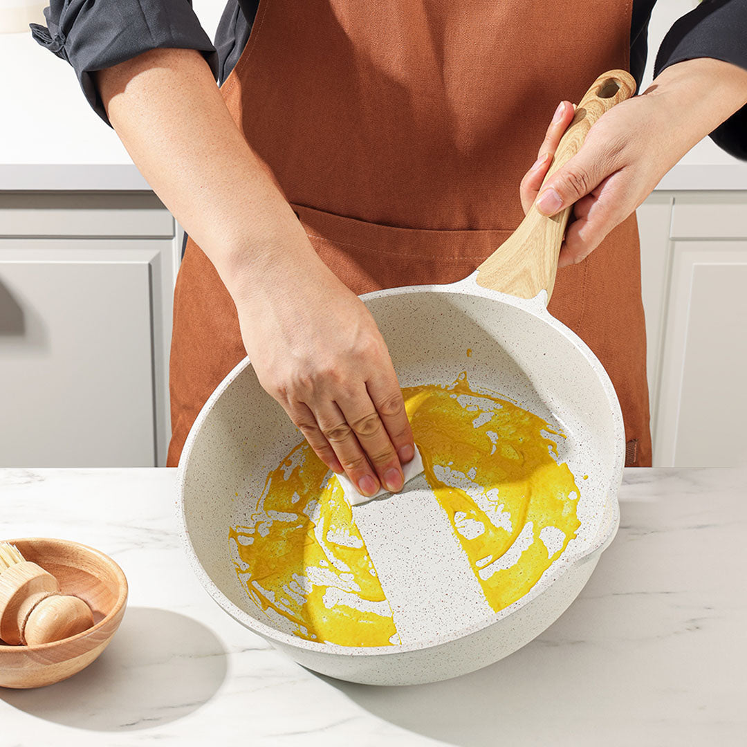 【簡単なお手入れ】スポンジで拭くか、水で洗うだけで簡単に洗浄でき、数秒できれいになります(食器洗い機の低温モードにも対応していますが、フライパン寿命を延ばすために手洗いをお勧めします)。